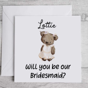 Will you be my BRIDESMAID card. Cute floral teddy card asking a child junior adult, for her, personalised, Flower Girl, wedding stationery