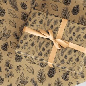 Eco Brown Kraft Christmas Wrapping Paper. Botanical gift wrap A3 recycled thick quality Forest Autumn. branches, acorns, pine cones, leaves