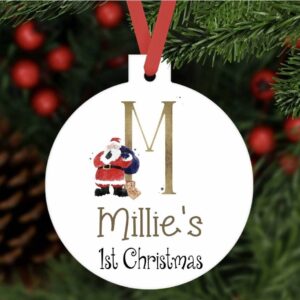 Personalised first Christmas bauble shaped ornament aluminium. Customised santa hanging tree decoration keepsake baby 1st Xmas gift present