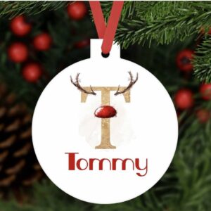 Personalised Christmas bauble reindeer initial ornament aluminium. Customised tree decoration keepsake baby child girl boy Xmas gift present