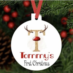 Personalised first Christmas bauble reindeer initial ornament aluminium. Customised tree decoration keepsake baby 1st Xmas gift present