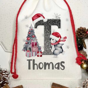 Personalised santa sack, with skating penguin, reusable burlap bag, Christmas eve sack, Drawstring heavyweight reuse, customised winter bag