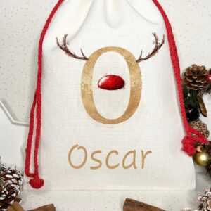 Personalised santa sack with reindeer antlers and bright nose Reusable burlap bag Christmas eve sack Drawstring heavyweight reuse customised