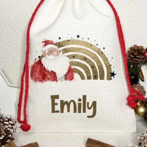 Personalised santa sack with santa and a rainbow Reusable burlap bag Christmas eve sack Drawstring heavyweight reuse customised