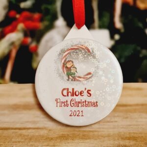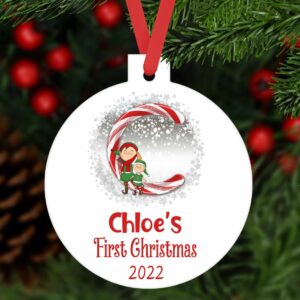 Personalised first Christmas bauble candy cane ornament aluminium. Customised santa tree decoration keepsake baby 1st Xmas gift present