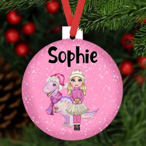 Personalised Dinosaur girl Christmas bauble ornament aluminium Customise hair eye skin tree decoration keepsake child pink Xmas gift present