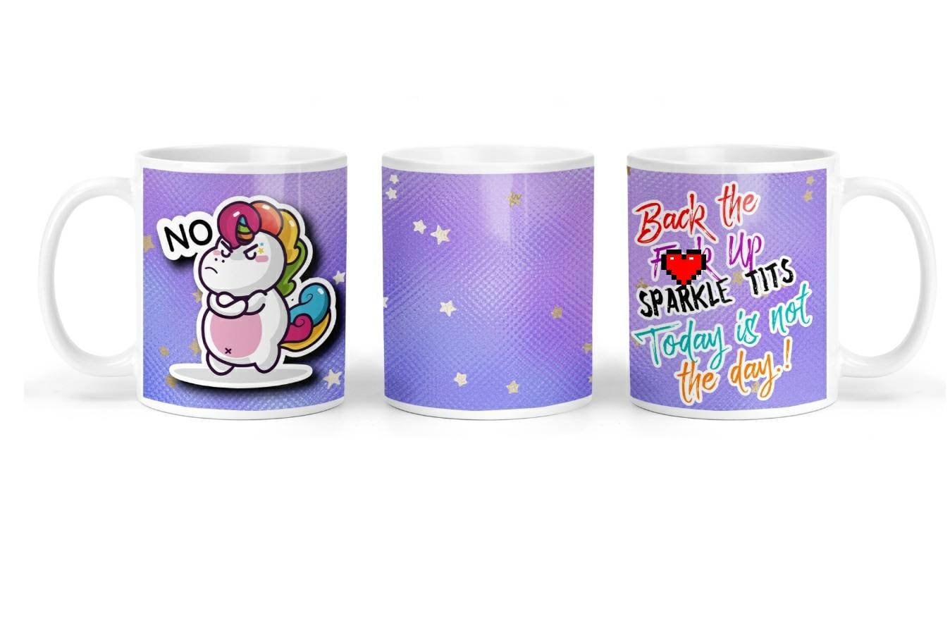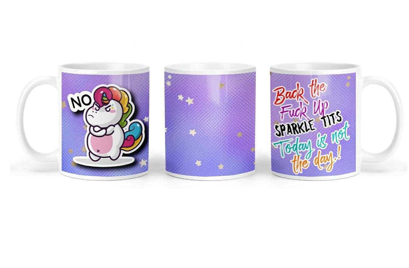 Adult unicorn sweary mug. Back the f*ck up SPARKLE TITS. Adult humour mug, sweary funny present. Humorous gift.