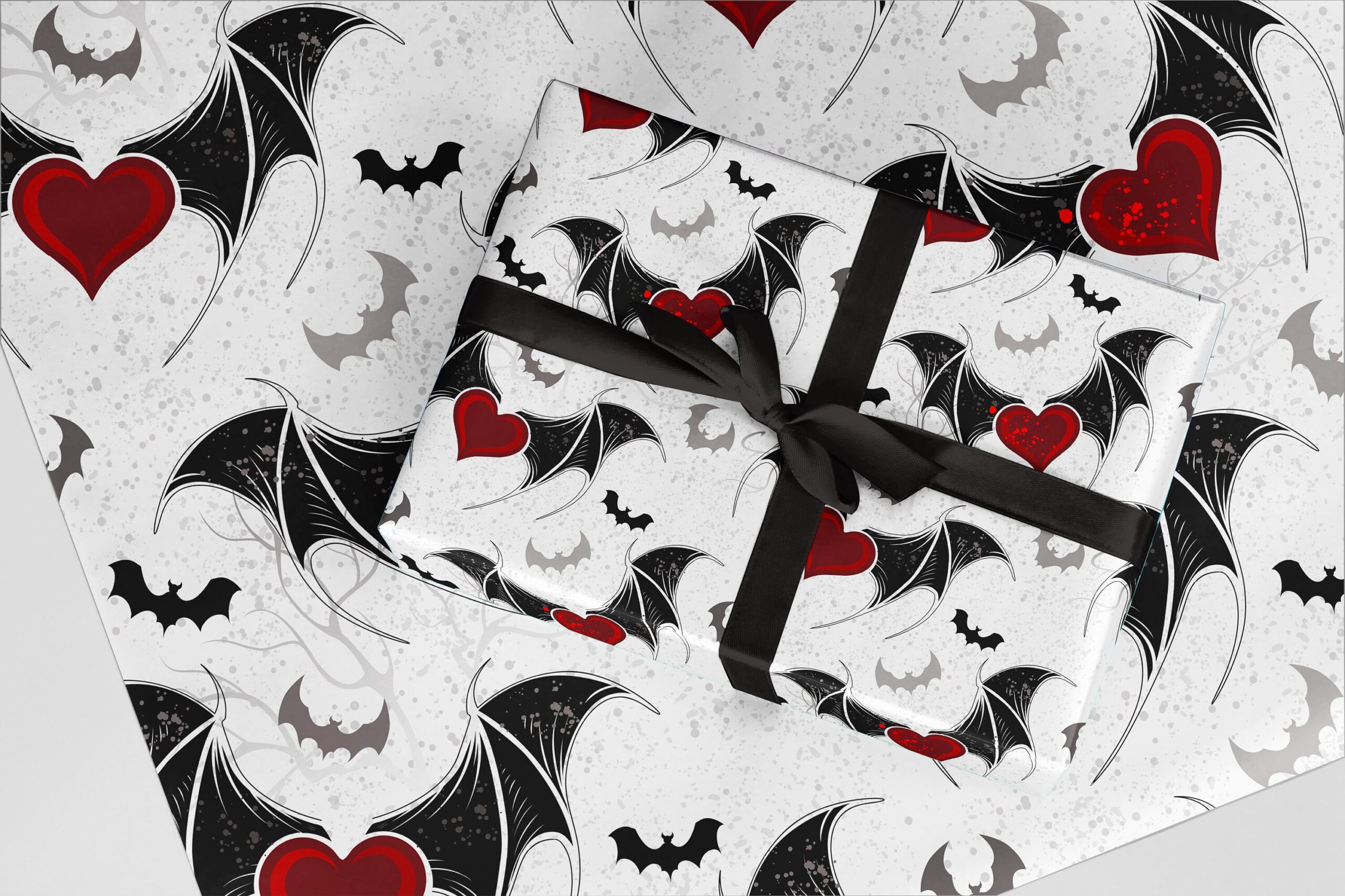 Horror Wrapping Paper, Black & White Bat Wings with Red Hearts design. Great for Valentine, Christmas and Birthdays