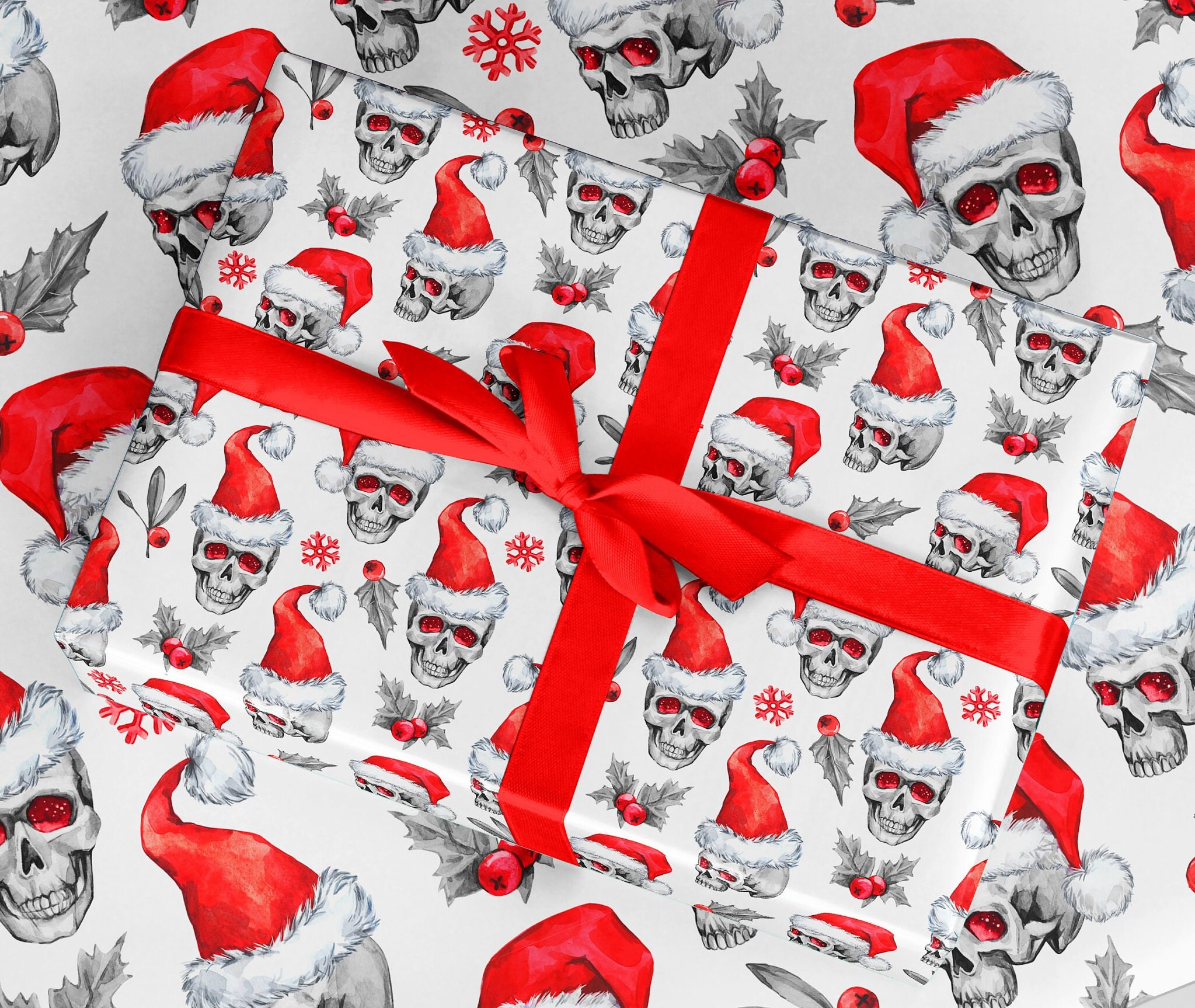 Christmas Wrapping Paper. Skulls with santa hats design. Eco friendly thick quality gift wrap paper. Perfect for wrapping Xmas presents.