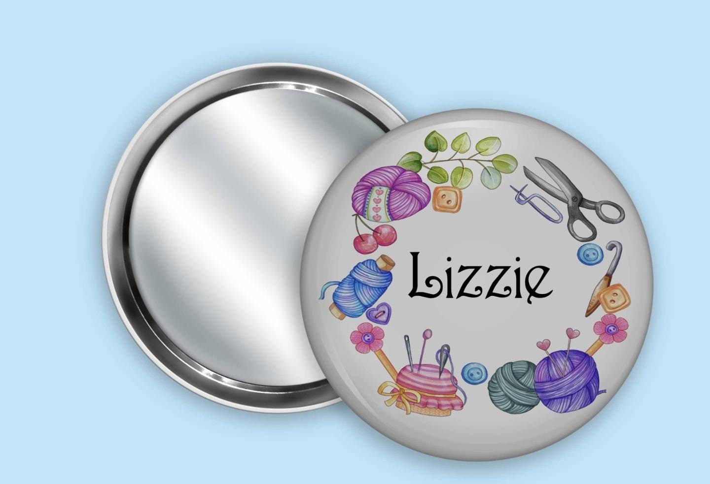 Crochet border, personalised with name, on the reverse of a button mirror.