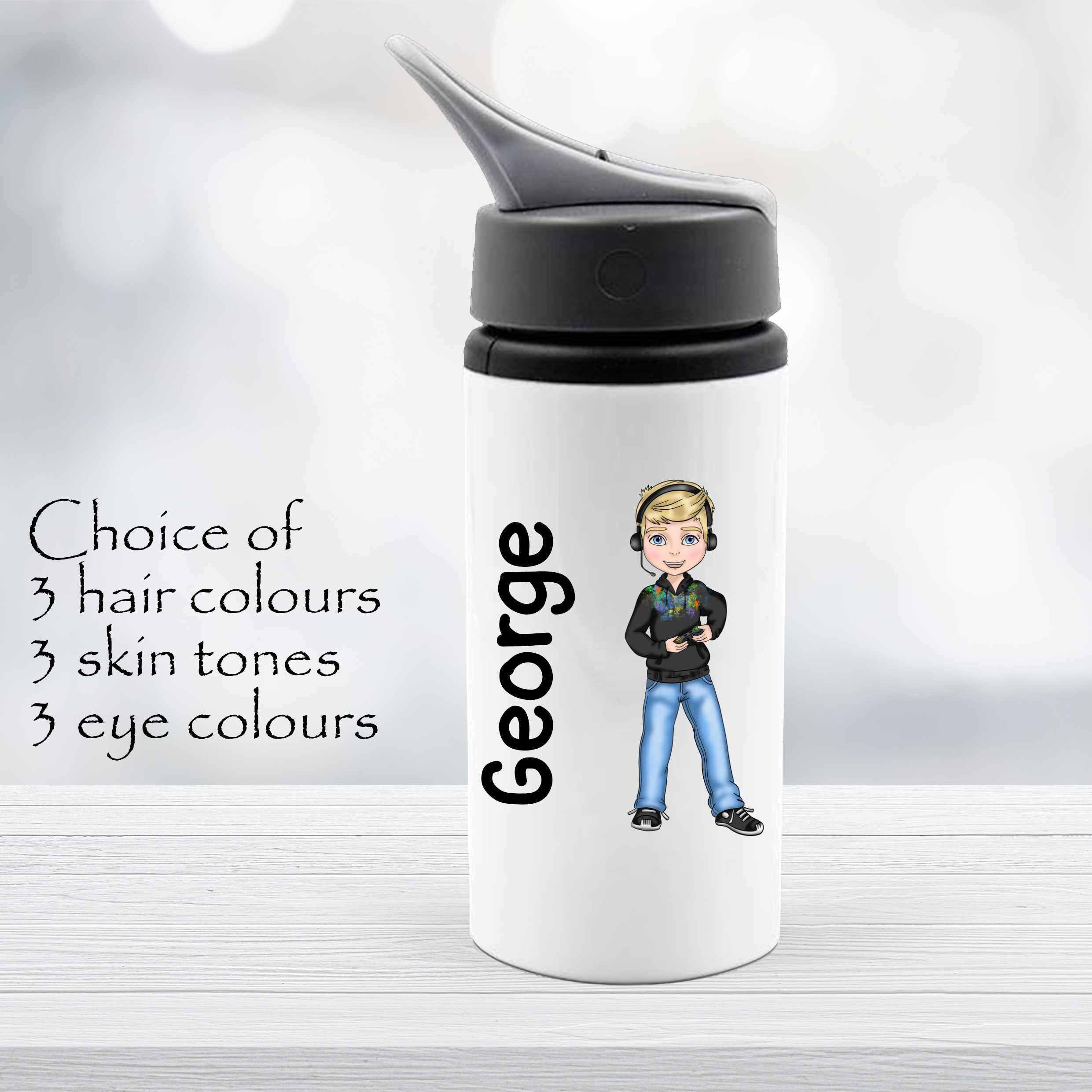 Personalised gamer boy / teenager 500ml drink water bottle, personalised with any name. Customise with a choice of 3 eye colours, 3 skin tones and 4 hair colours. Great for back to school, birthday gift for the hard to buy for gamer, or Christmas present