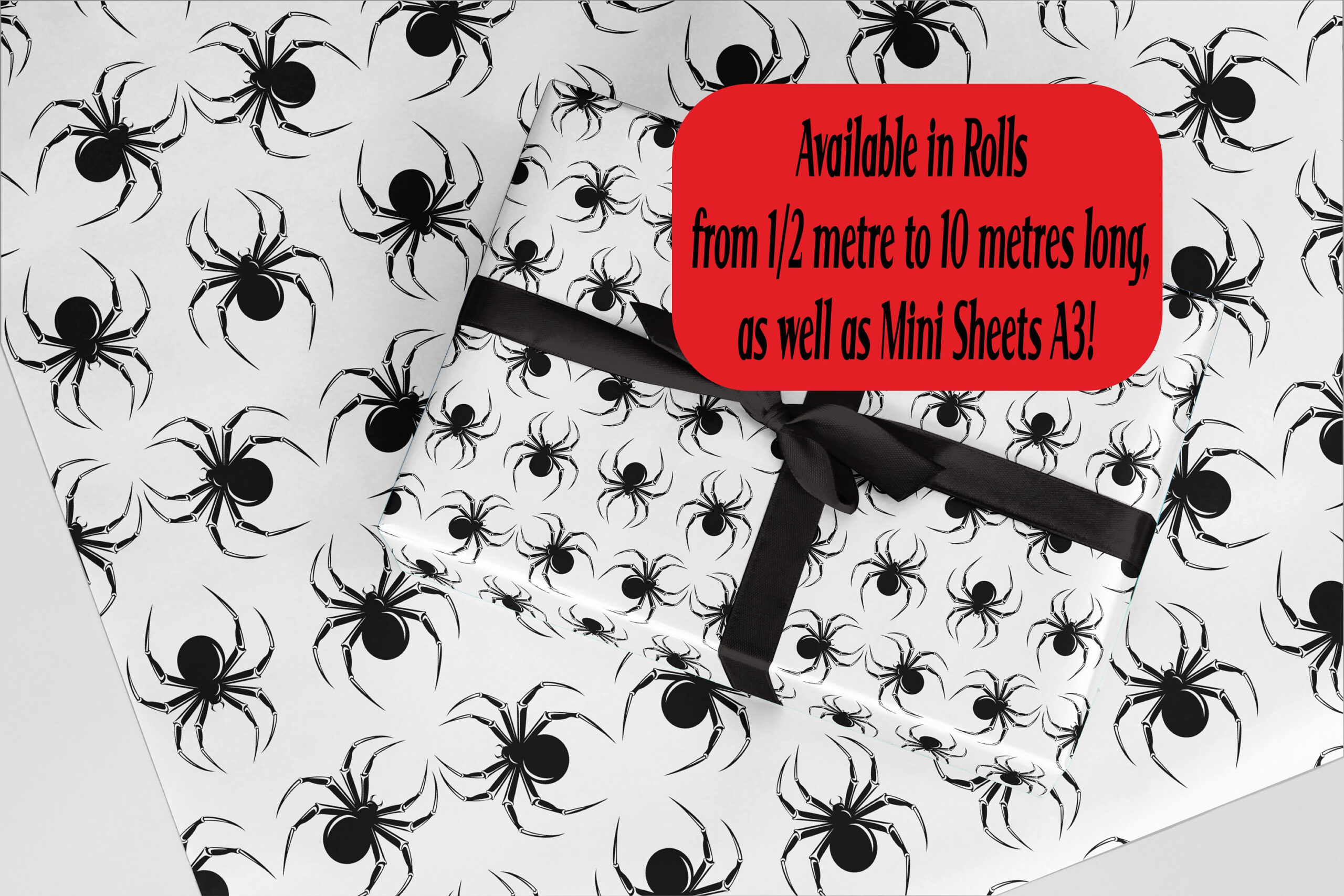 Horror Wrapping Paper, Black & White Spider design. Great for Halloween, Valentines, Christmas and Birthdays.
