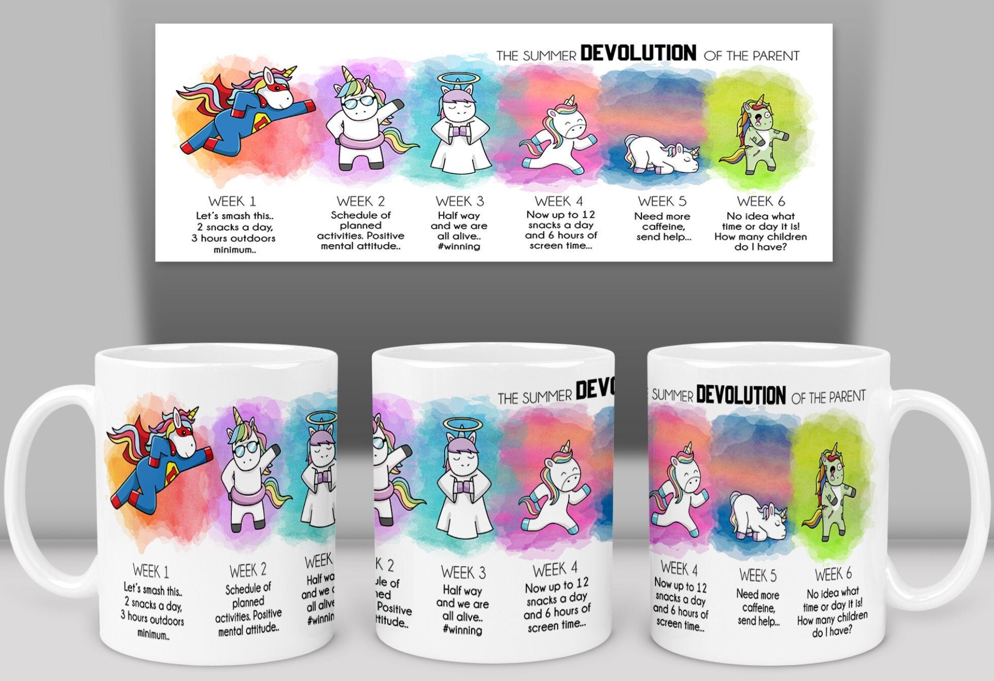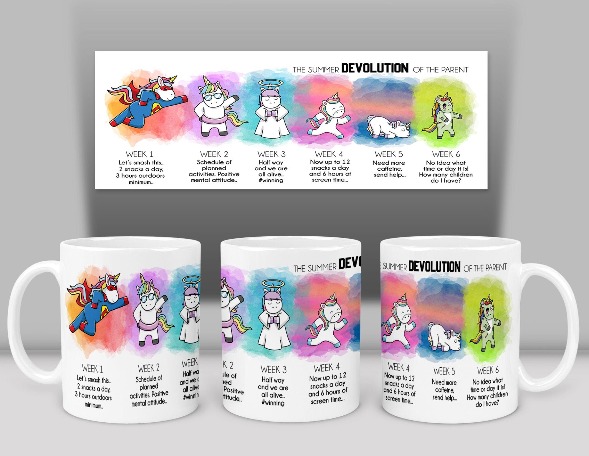 Humorous Mug showing The Summer Devolution of a Parent and the effects of looking after the little darling over the six weeks summer holidays.