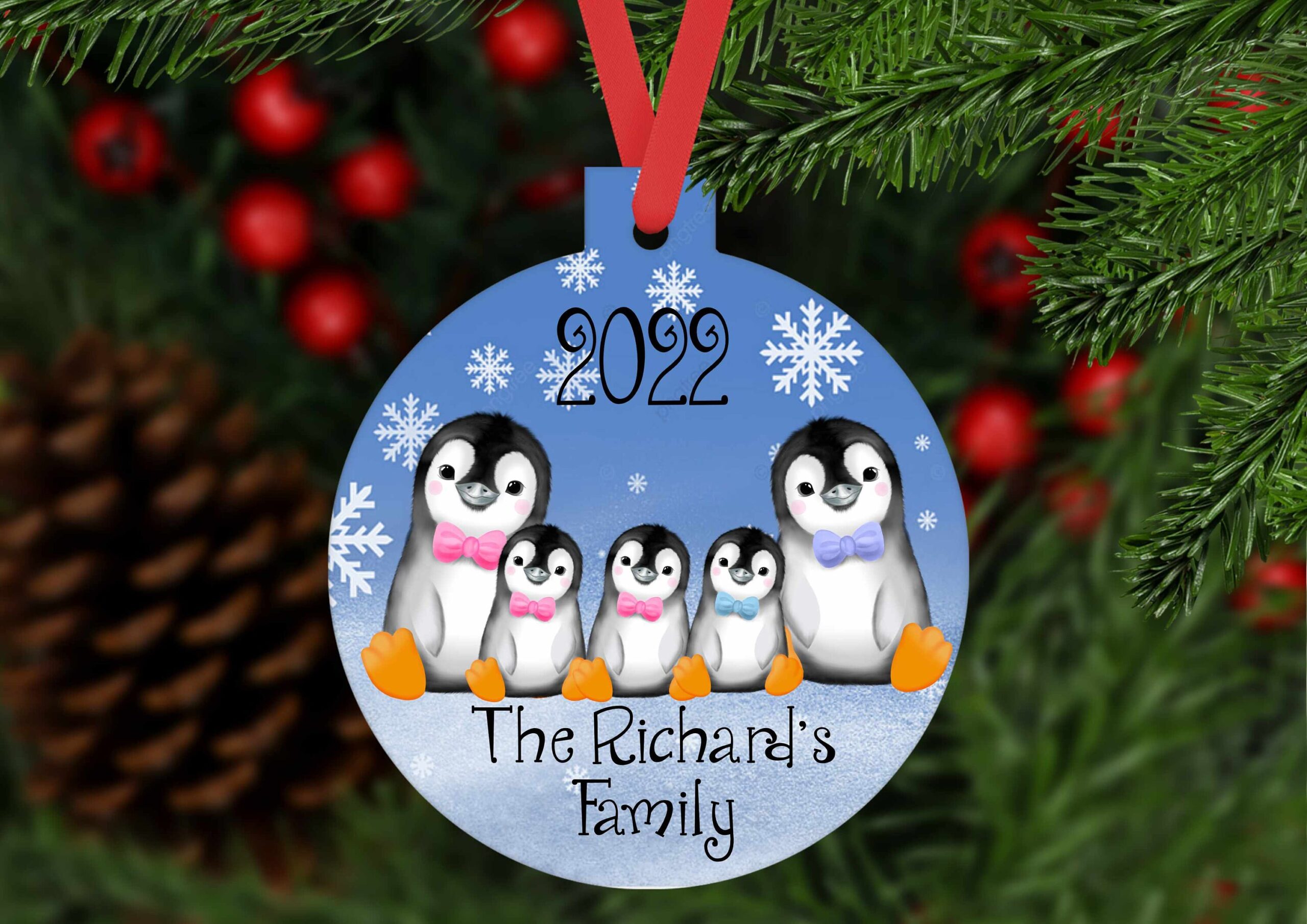 Penguin family Christmas bauble year 2022 aluminium Customised tree decoration keepsake gift present personalised family adults and children