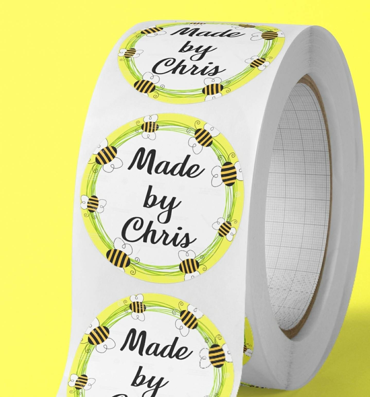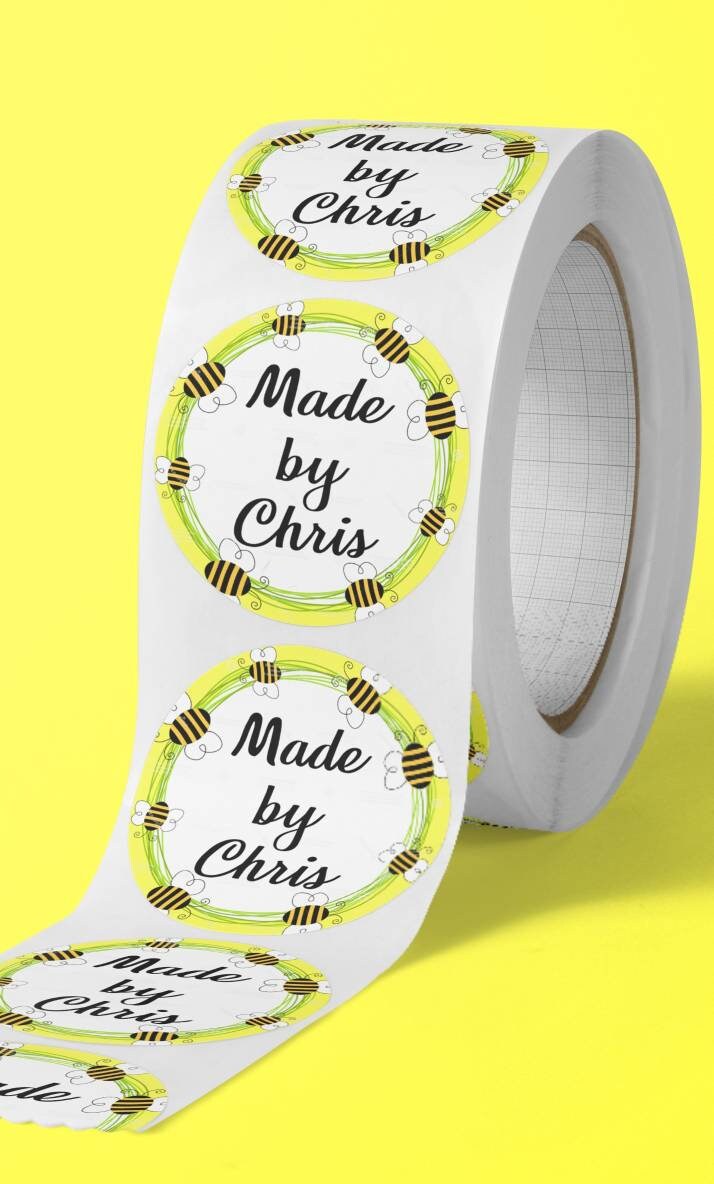 Personalised handmade by bees frame design customised name label. Packaging. Branding craft sticker envelope box. Business crafting bee