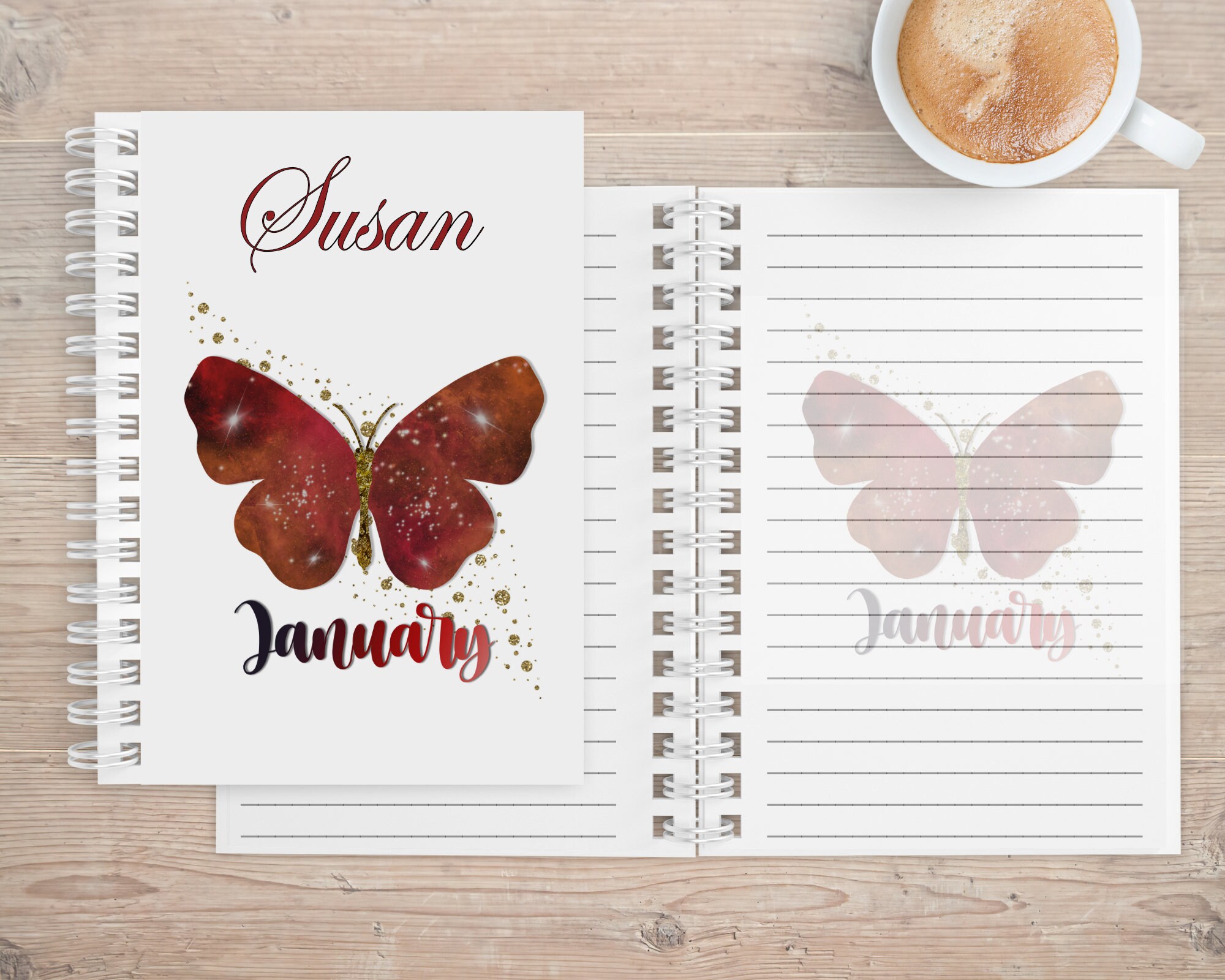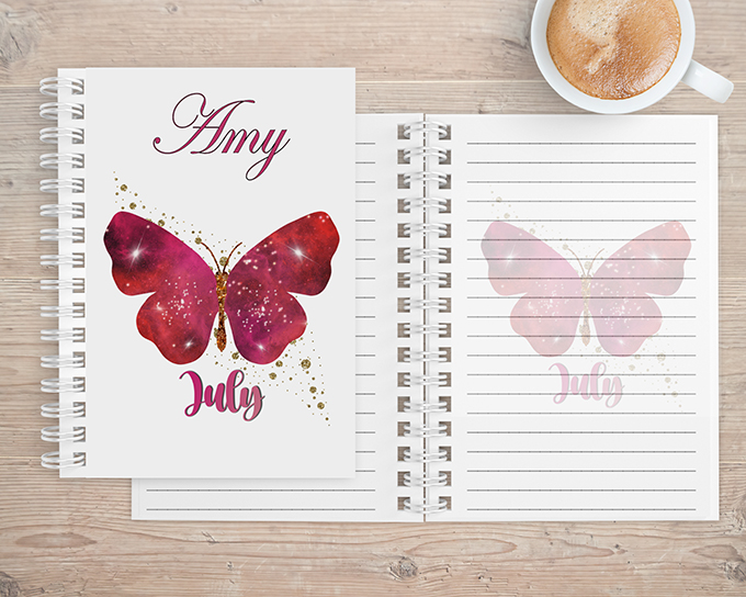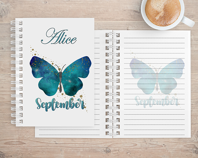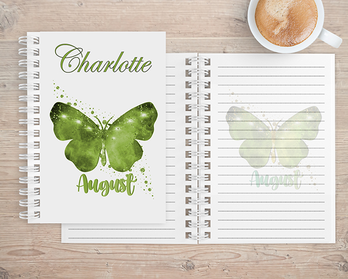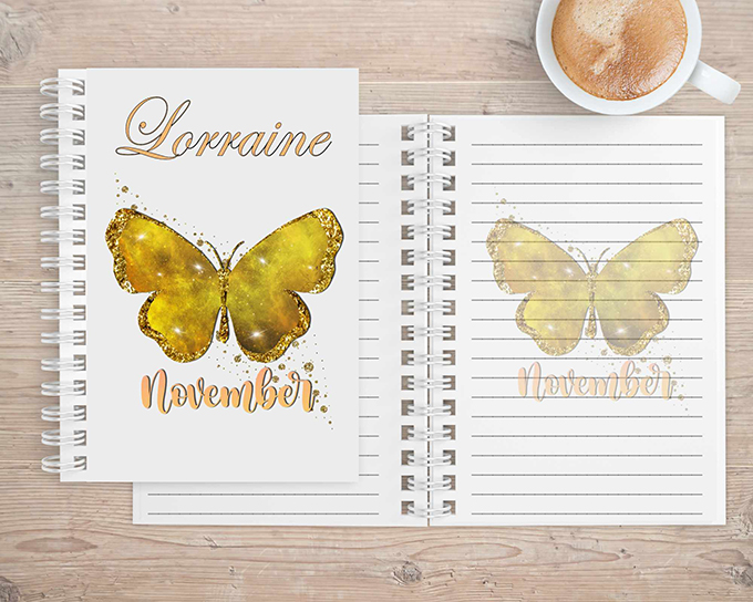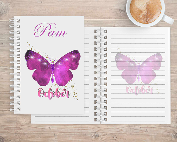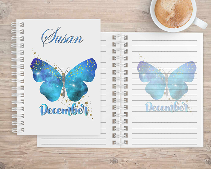 The notebook is available with image of Butterfly and birth month inlaid on either 1 side or both sides.
