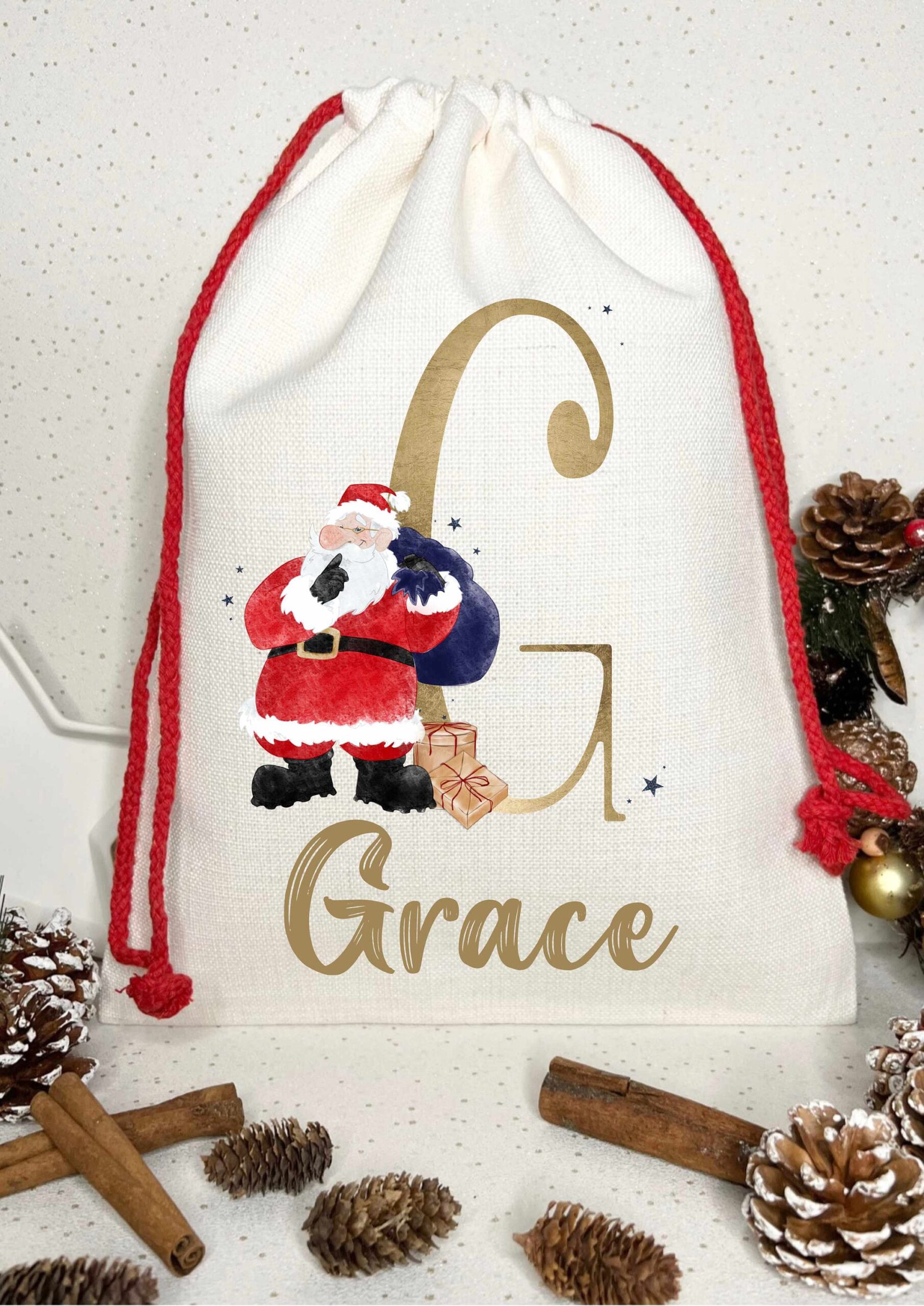 Personalised santa sack, with hushing santa. Personalised with initial and name.