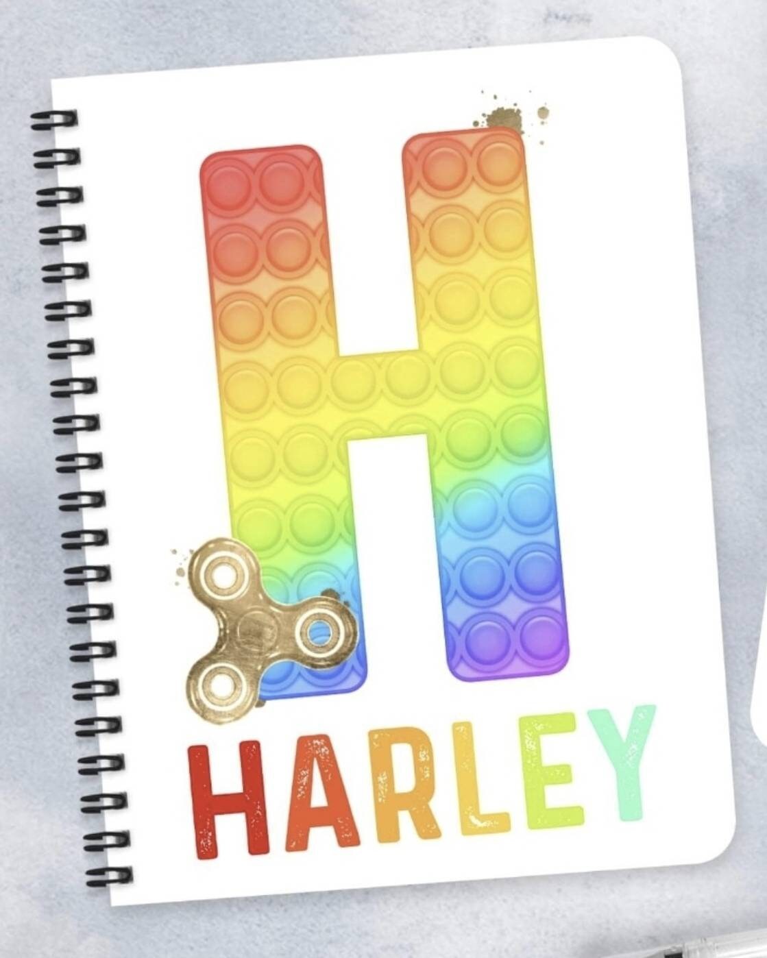 Pop it fidget gift set personalised rainbow childrens notebook tote bag, greetings card pen, stickers. Birthday gift pack for girl boy party