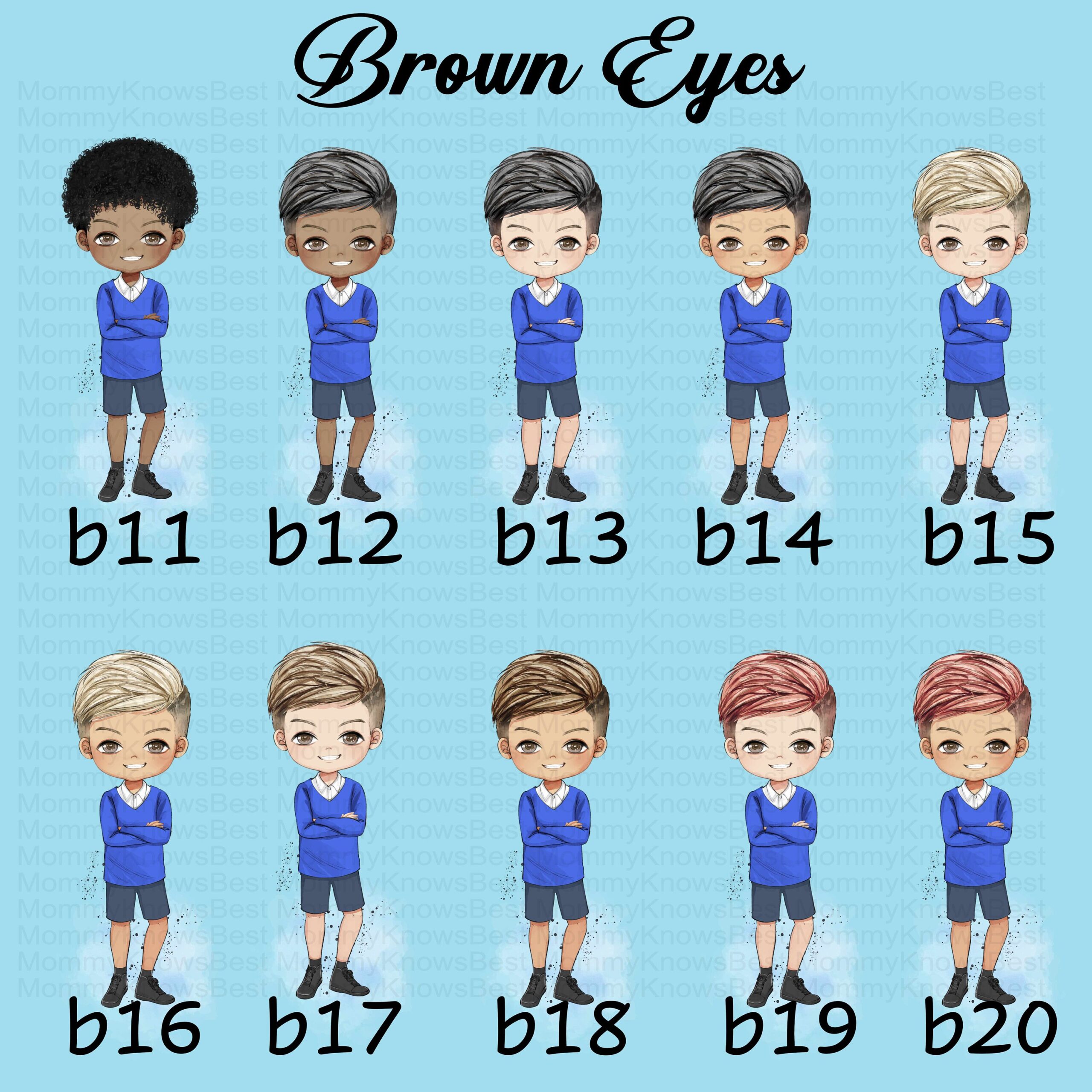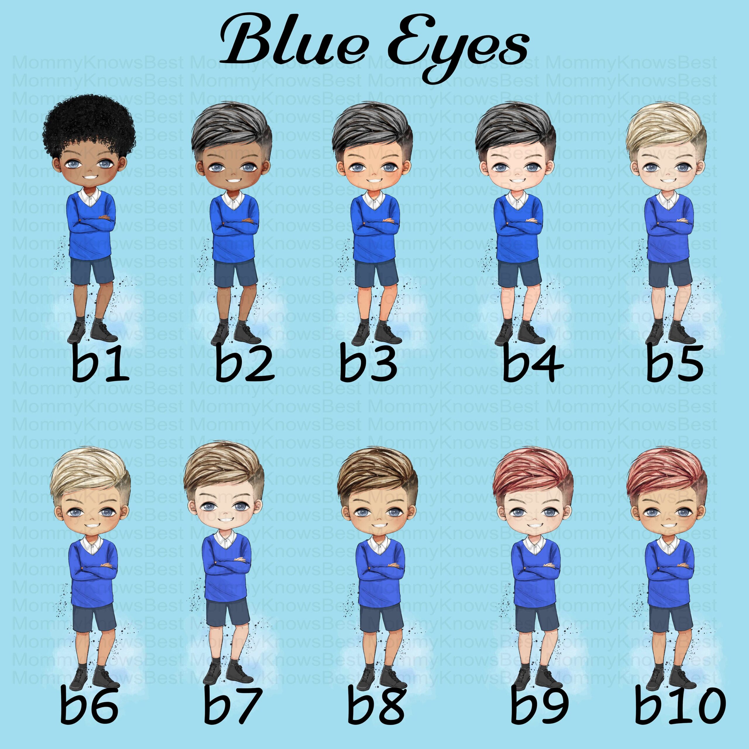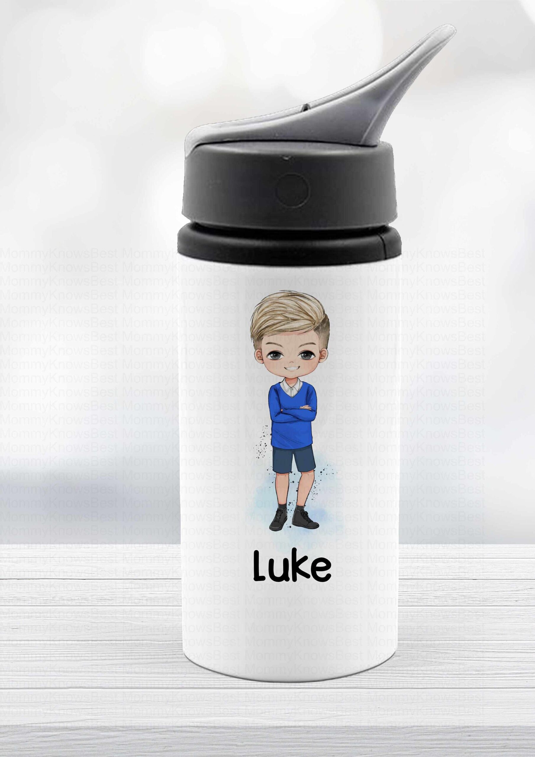 Children’s 500ml drink water bottle, personalised with child’s name. This is for a blue uniformed boy, with the choice of hair colour, eye colour and skin tone, to personalise especially for your child.
