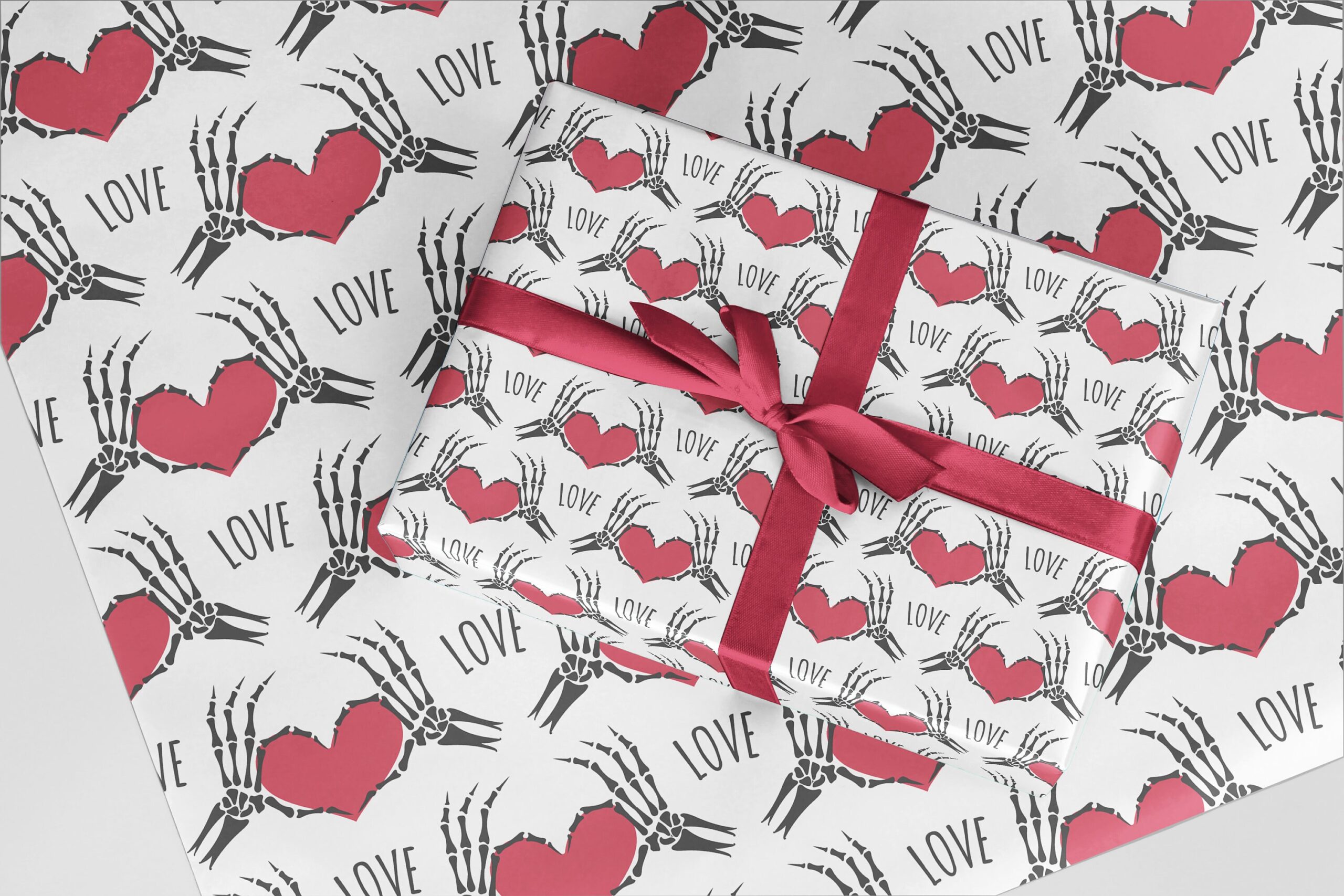 Horror Wrapping Paper, Black, White & Red Skeleton hand holding Heart Love design. Great for Valentine, Christmas and Birthdays