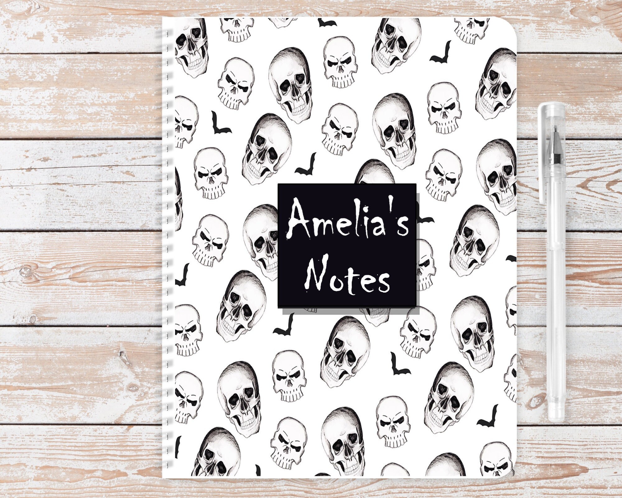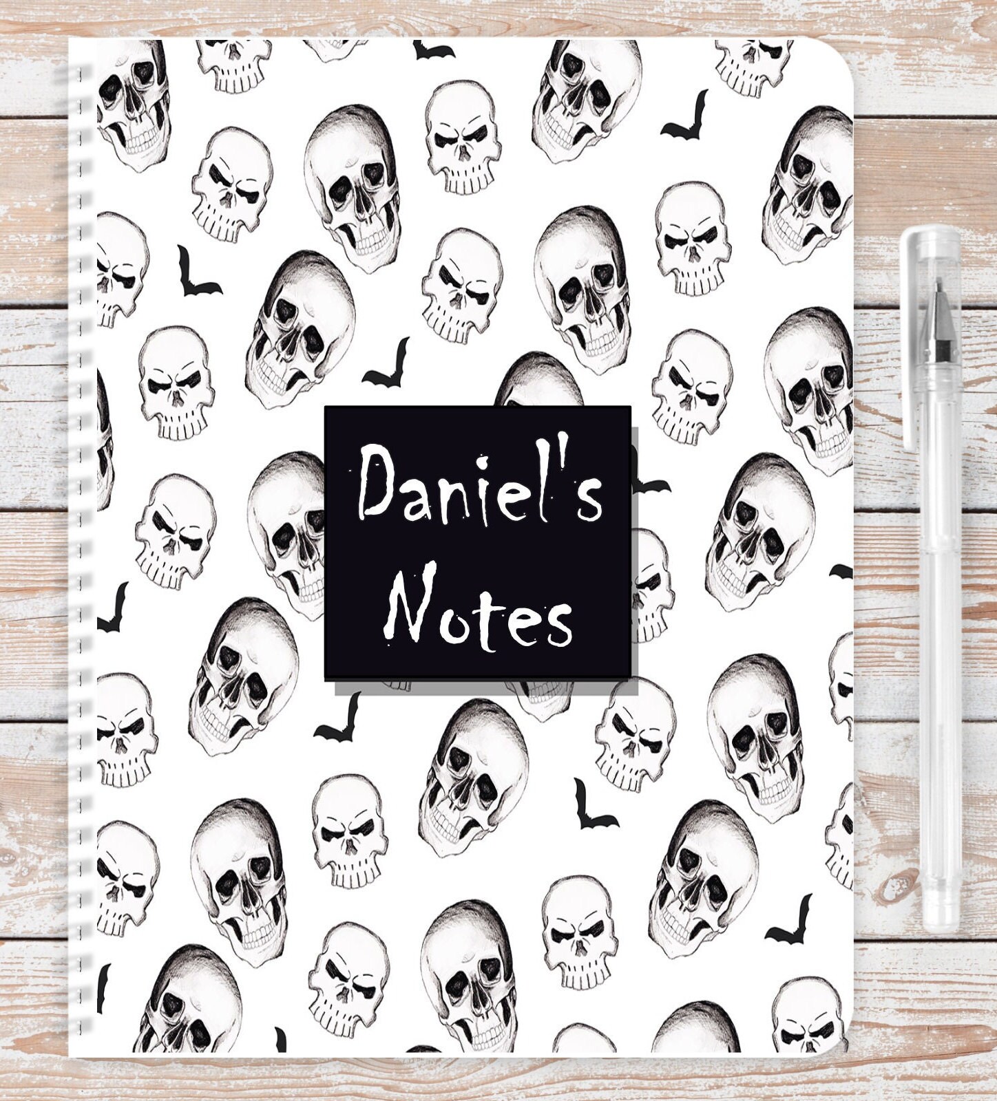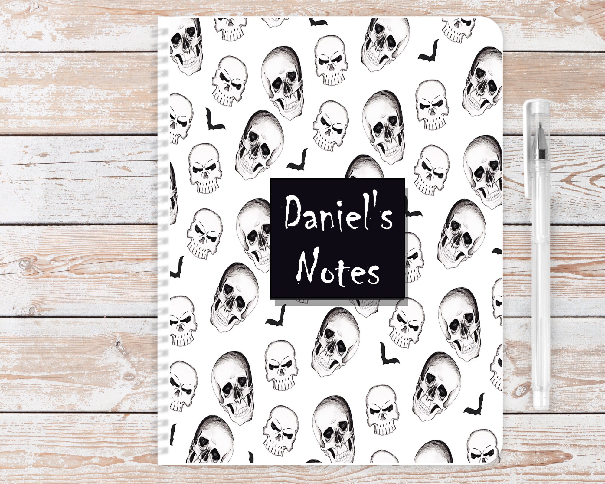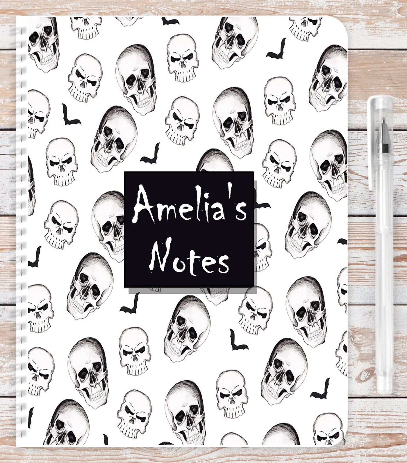 Skull images Personalied A5 notebook. Contains 60 sheets of lined or blank 100% recycled paper. Eco friendly. bio-degradable. Halloween gift