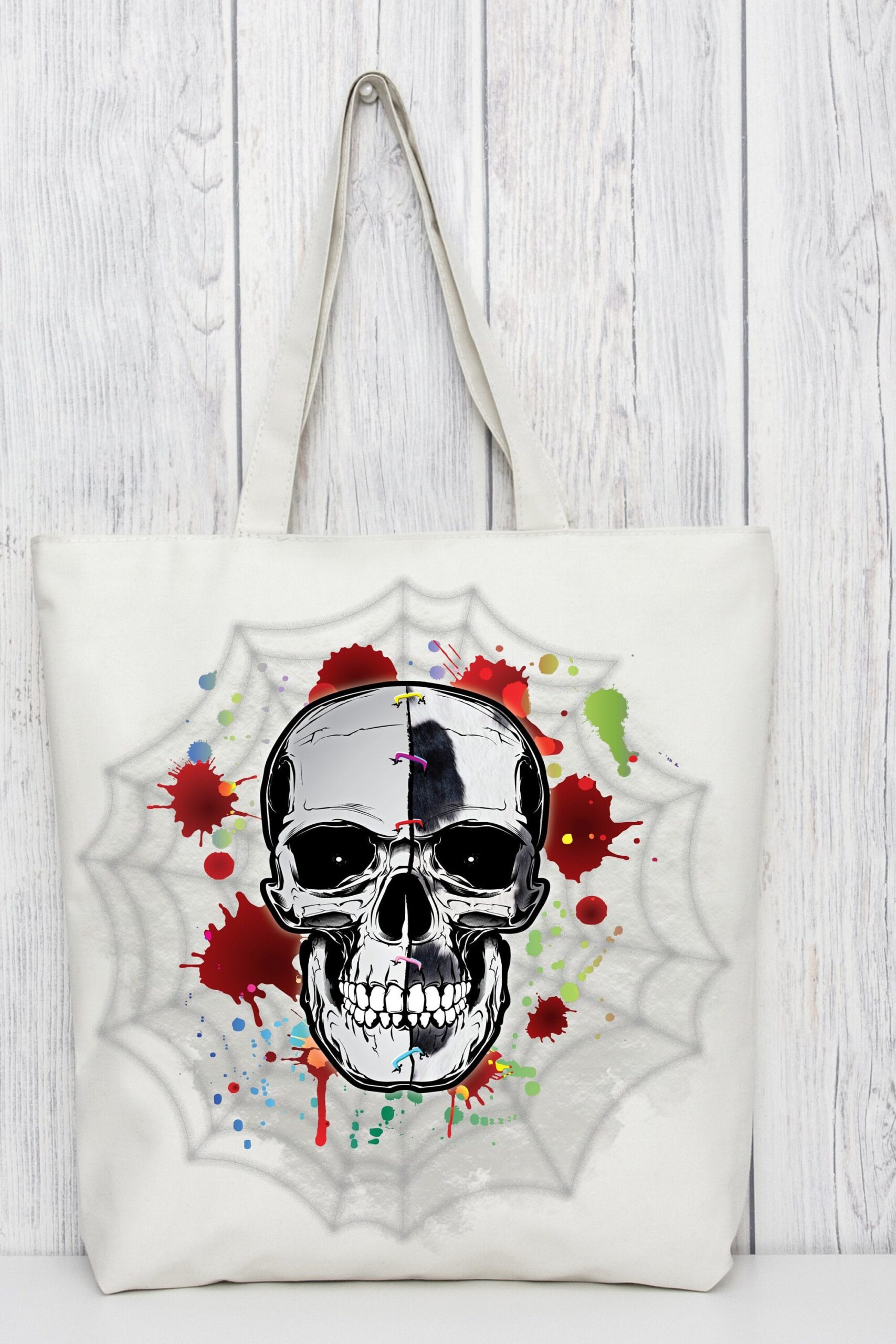 Skull on a cobweb Tote Bag gift. Unusual present for him or her or self. Gothic design re-usable bag for life. Goth horror art design.
