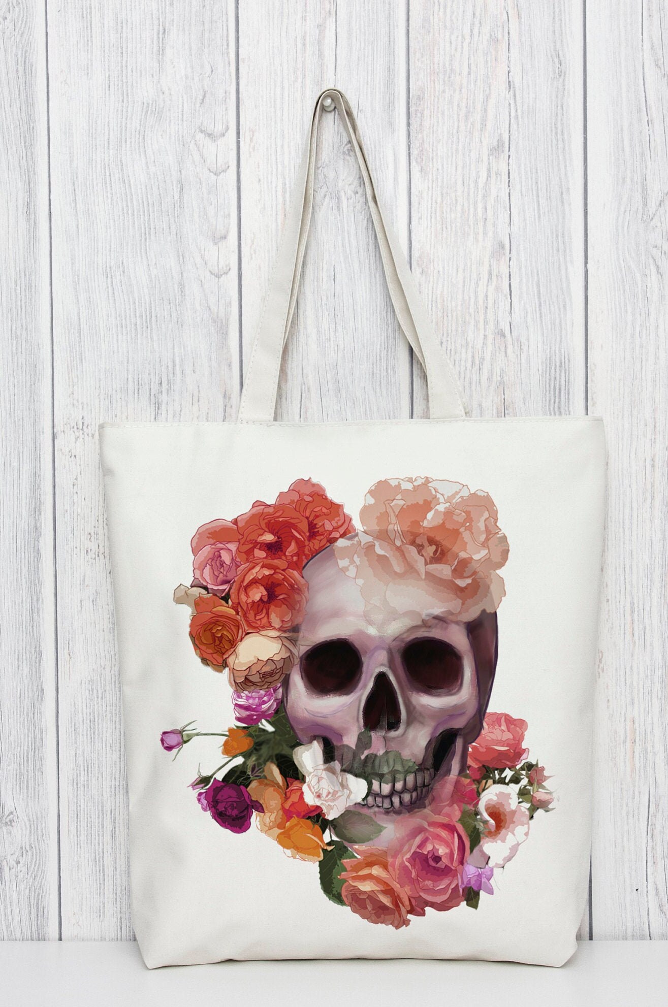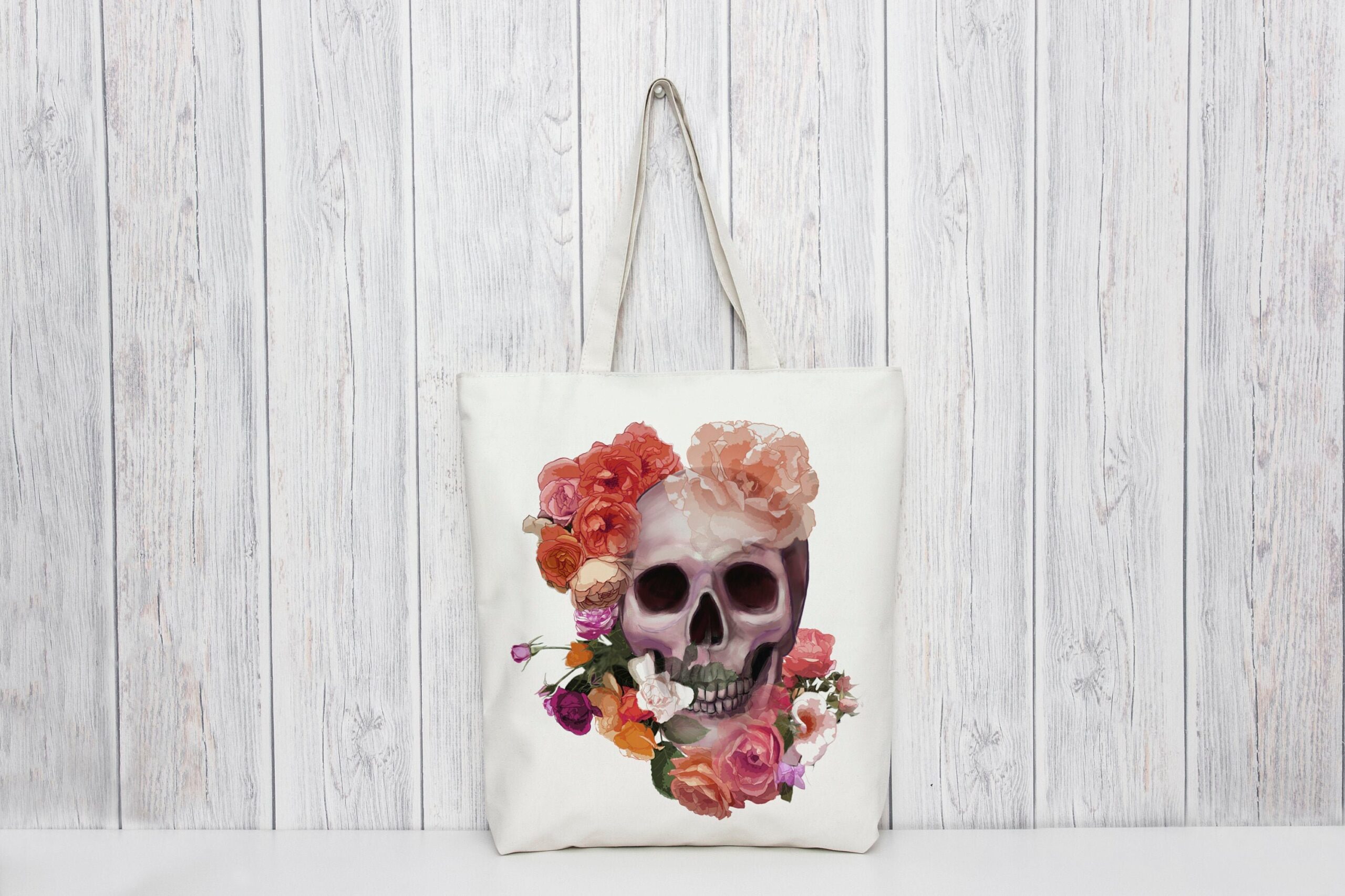 Skull with colourful flowers Tote Bag gift. Unusual present for him or her or self. Gothic design re-usable bag for life. Goth art design.