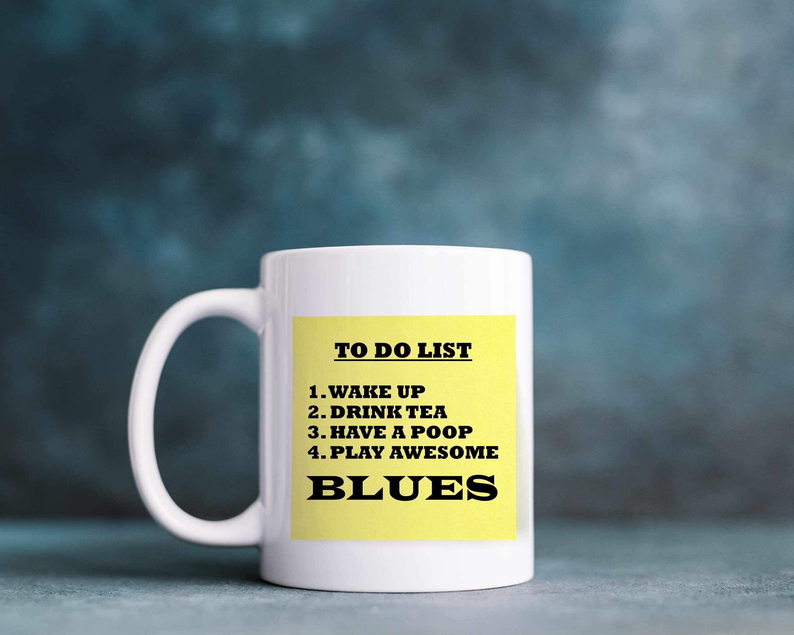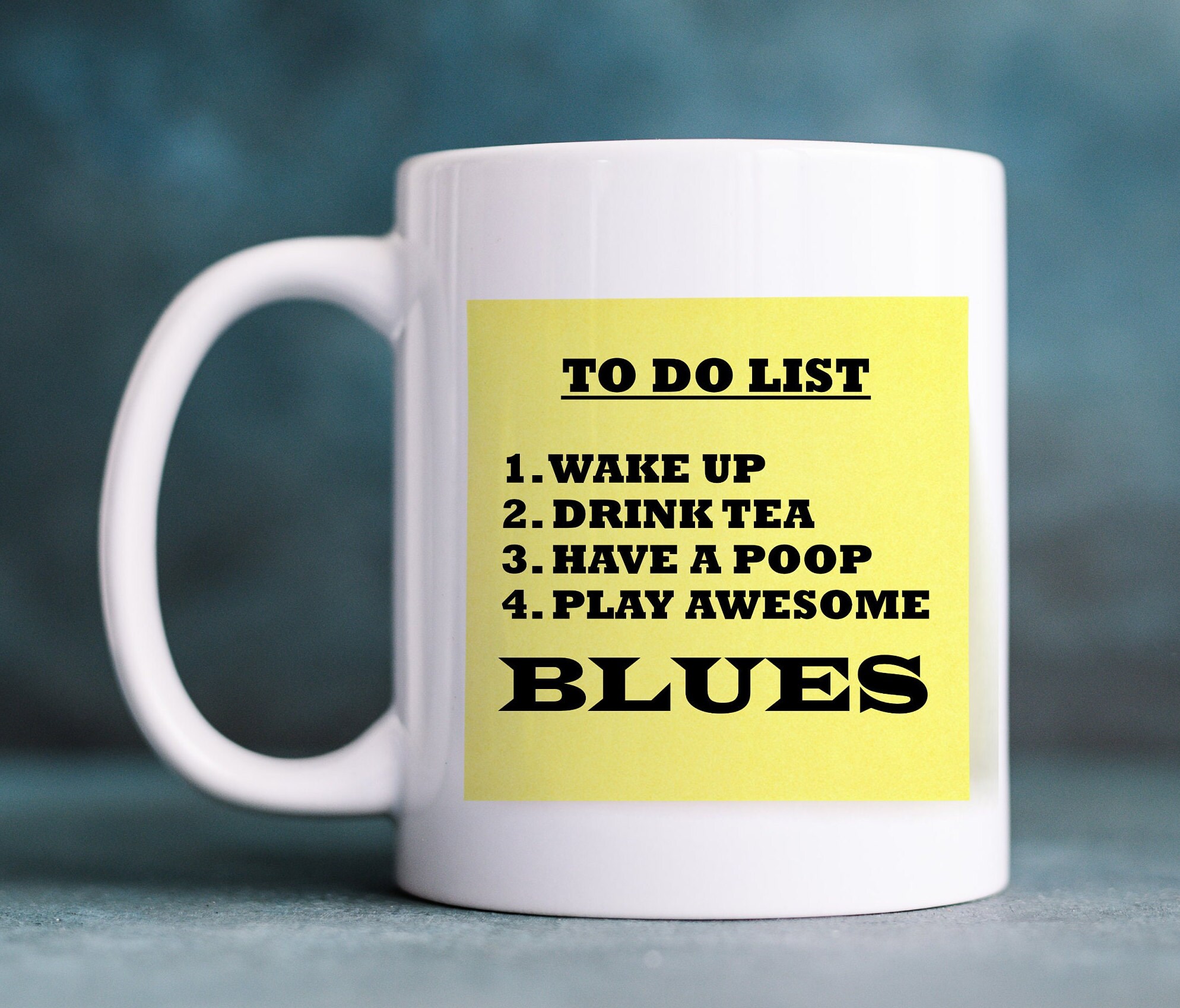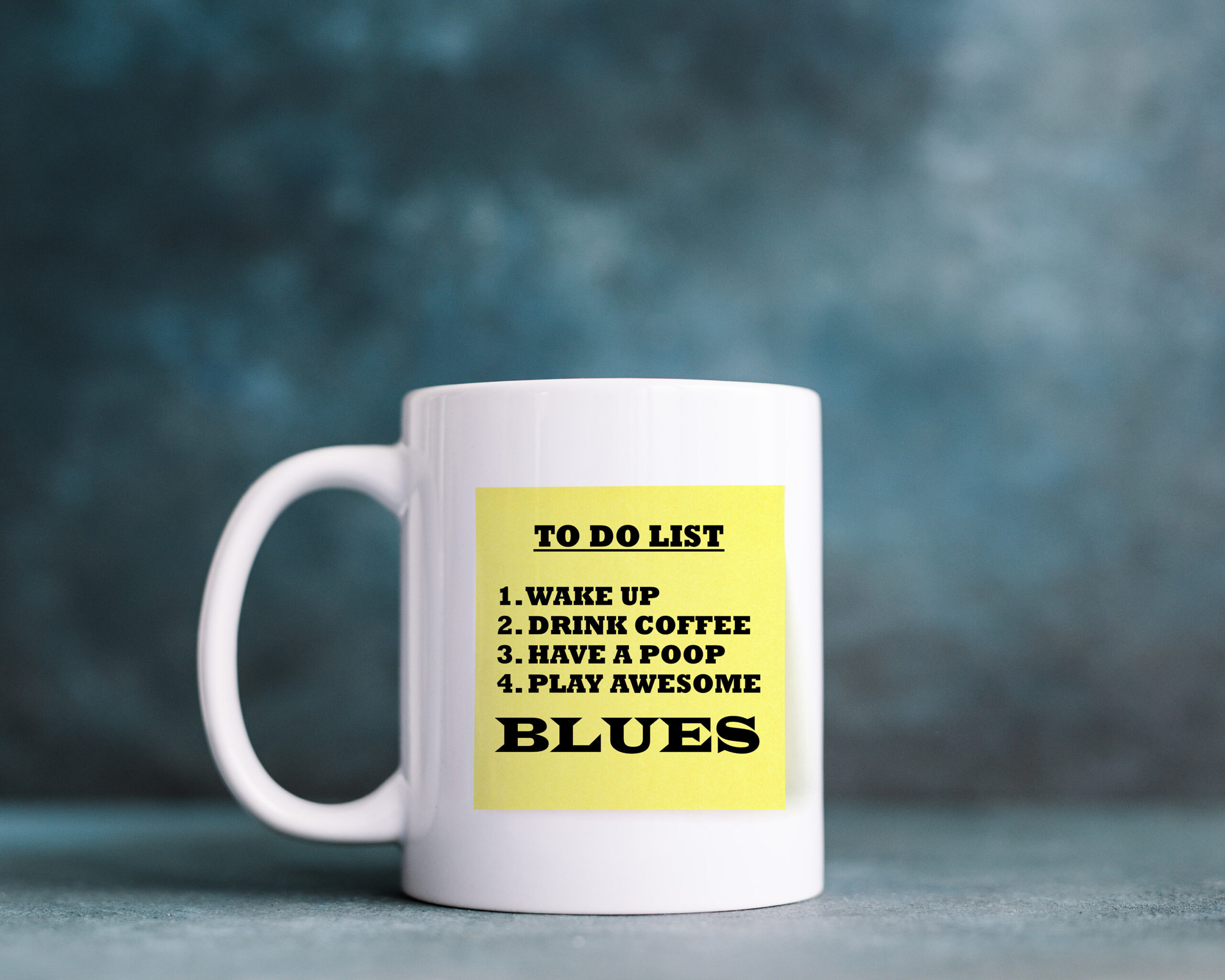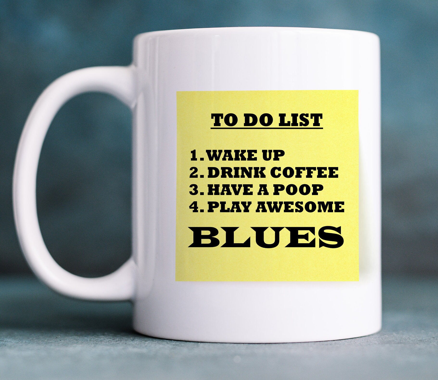 Humorous Sticky Note mug Drink Coffee, listen to awesome BLUES music