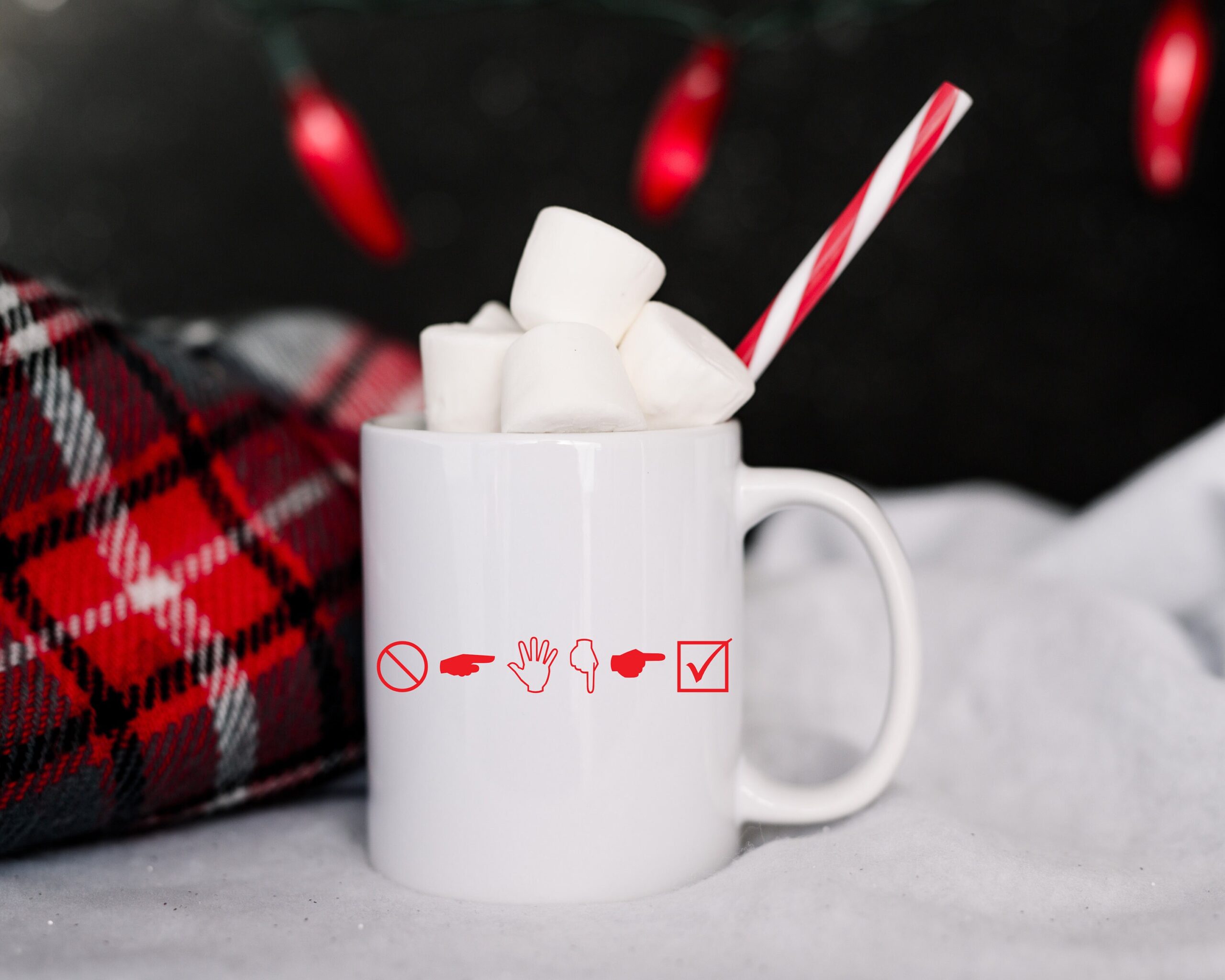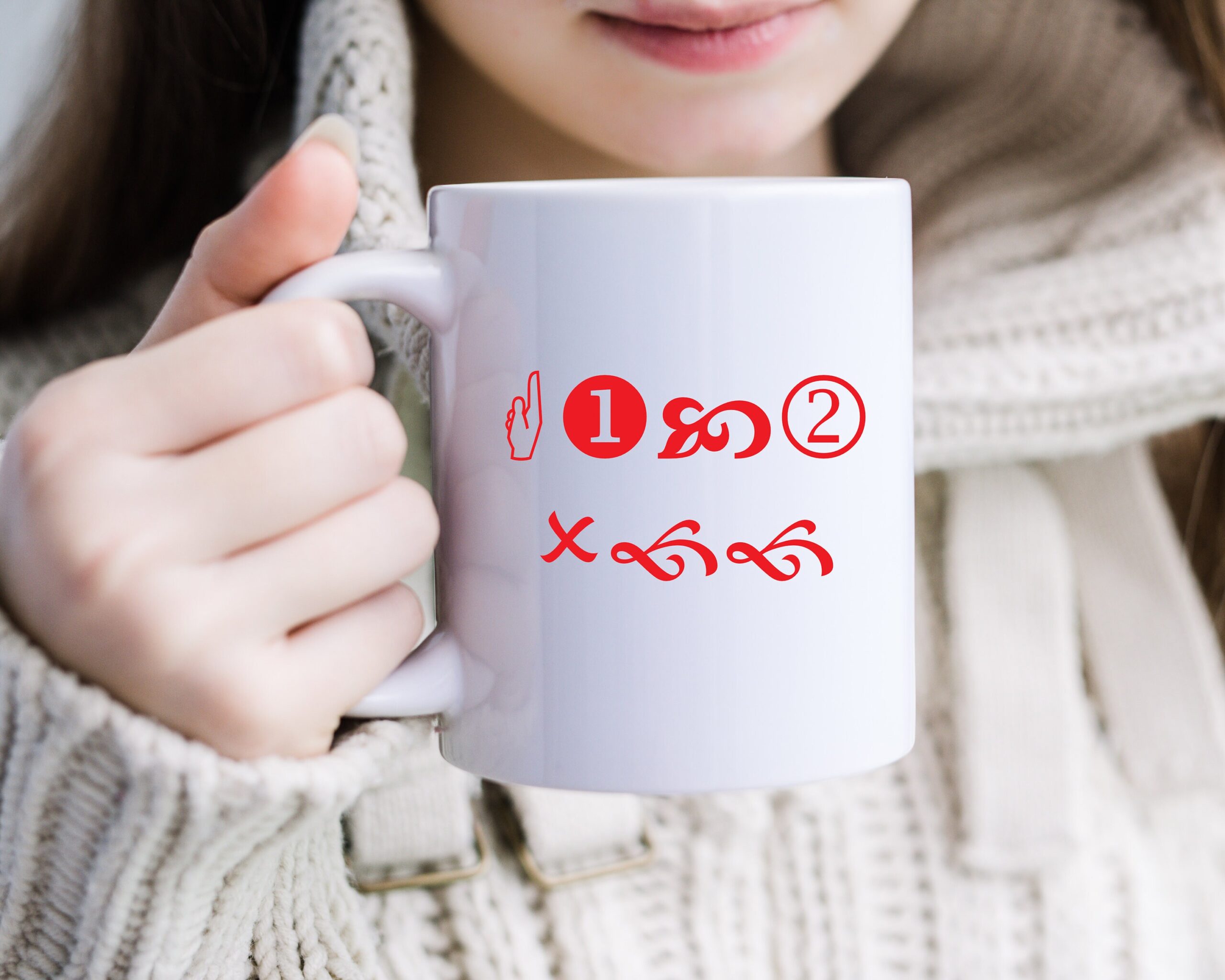 10oz ceramic white mug. Image is printed on both sides of the mug.