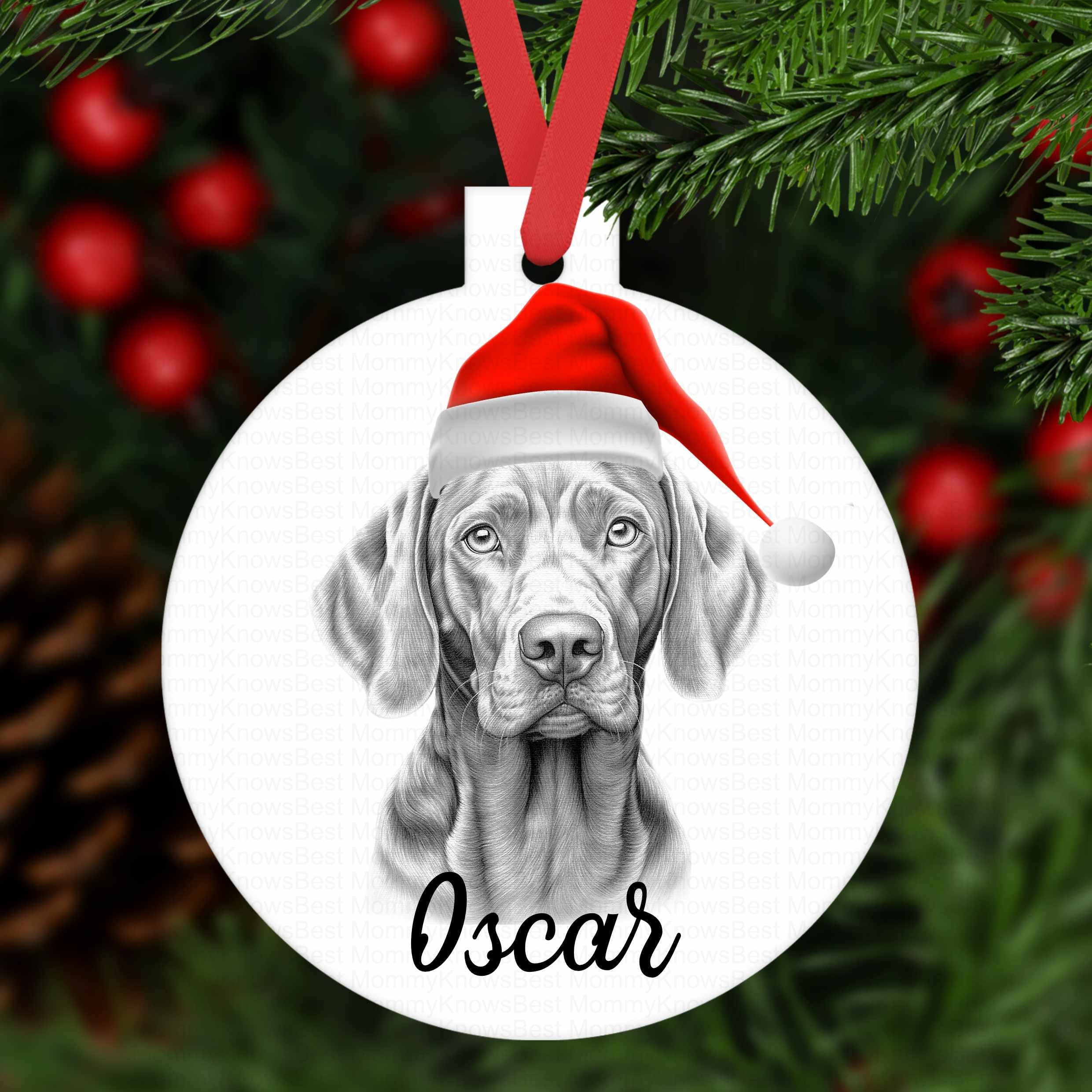 WEIMARANER Christmas bauble ornament made from aluminium, hung with red ribbon.