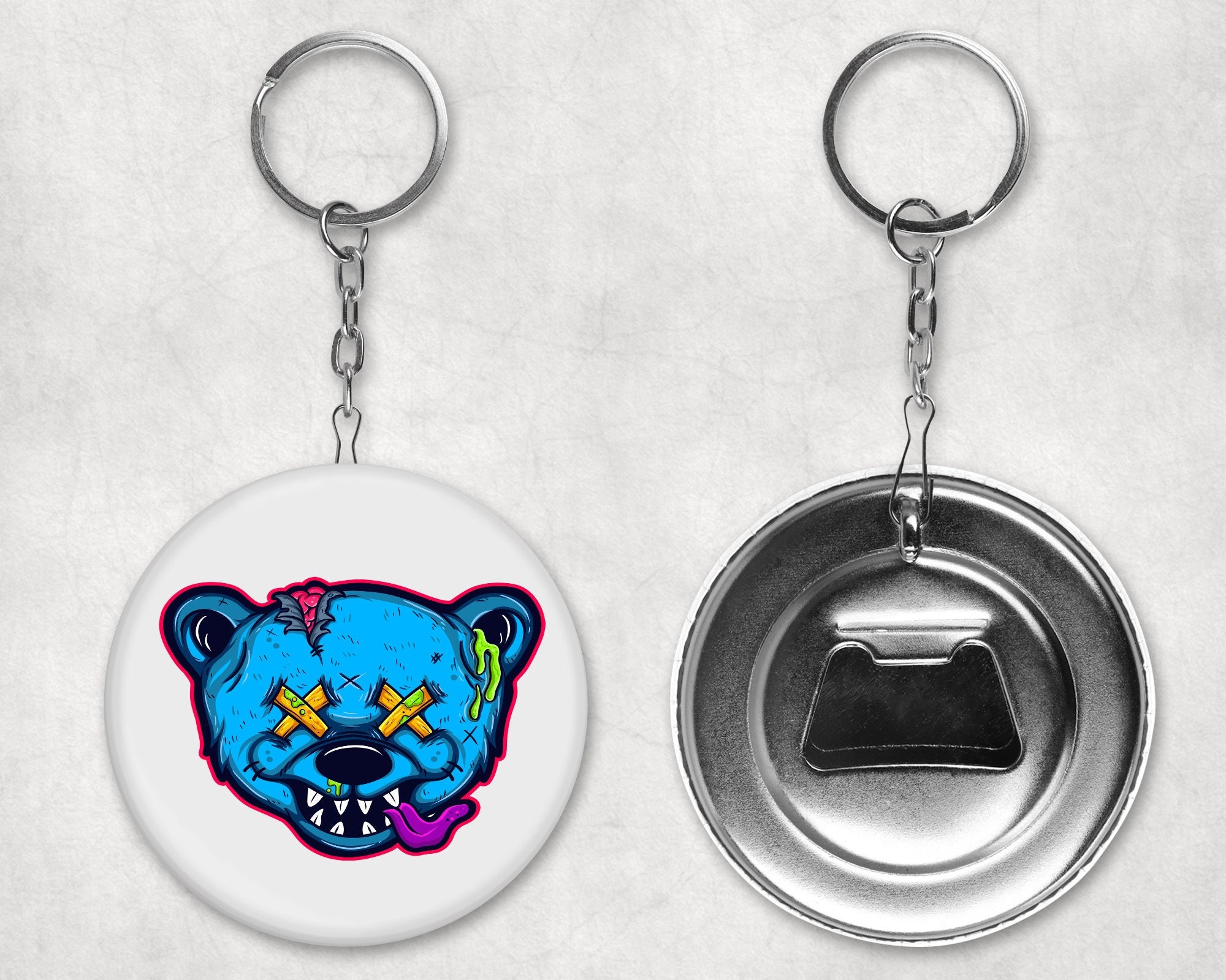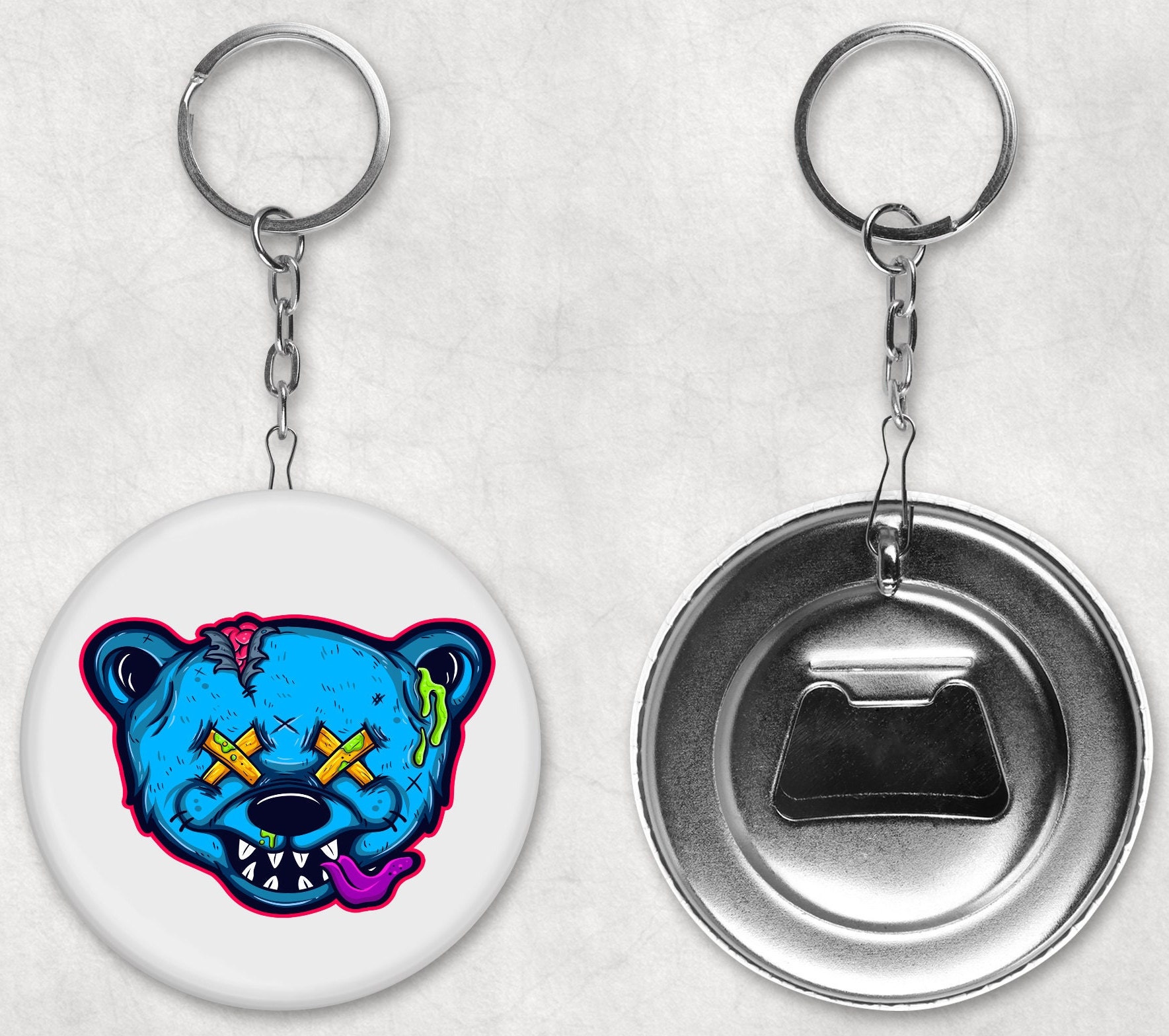 Image is on the front with metal bottle opener and keyring chain on the reverse.