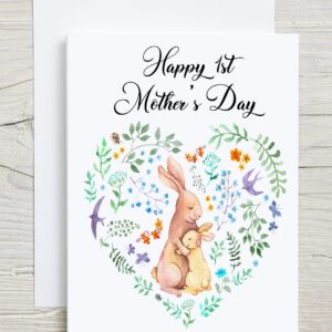 Happy 1st Mother’s Day Card with Rabbit and Kitten design. Baby’s first Mothers Day gift Cute Animal Card special Mum Day Mother & Baby Card