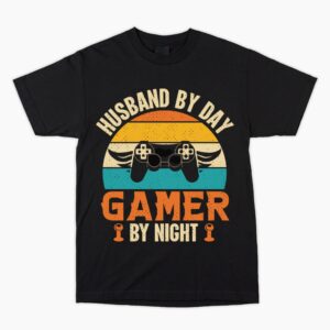 Husband By Day Gamer By Night Tshirt, Unusual Colourful Fun Gift Him Dad, Perfect Father’s Day Birthday Christmas Ideal for old school gamer